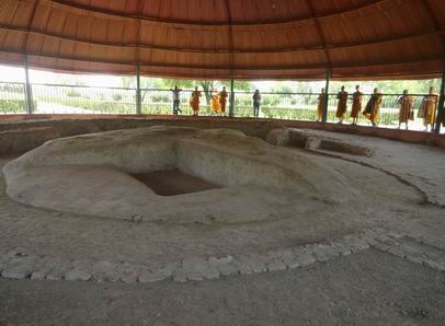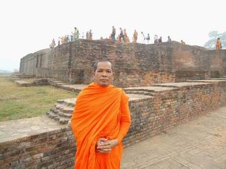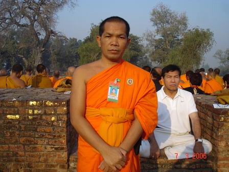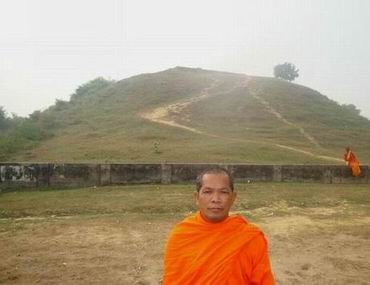 ปริปุณฺณสีโล กับซากของสถูป ซึ่งเป็นอนุสรณ์สถาน