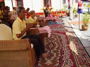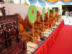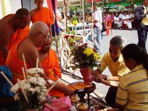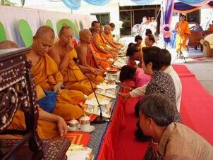 กำลังถวายจตุปัจจัยไทยธรรมแด่พระสงฆ์