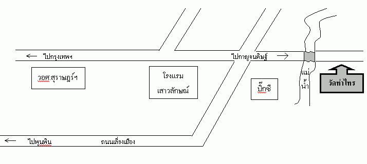 เข้าตัวเมืองสุราษฎร์ธานี ลงรถที่ ตลาดเกษตร1, ต่อรถประจำทางไปท่าทองใหม่ (ใกล้ตลาดเกษตร 1) แล้วลงรถหน้าวัดท่าไทร