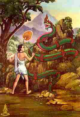 จึงลาพระฤาษีไป เดินสาธยายมนต์ไปด้วย นาคที่ขึ้นมาเล่นน้ำ ได้ยินมนต์ก็ตกใจ