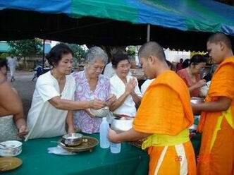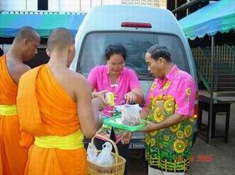 หมอปู กำลังช่วยกันใส่บาตรพระด้วยความยินดี