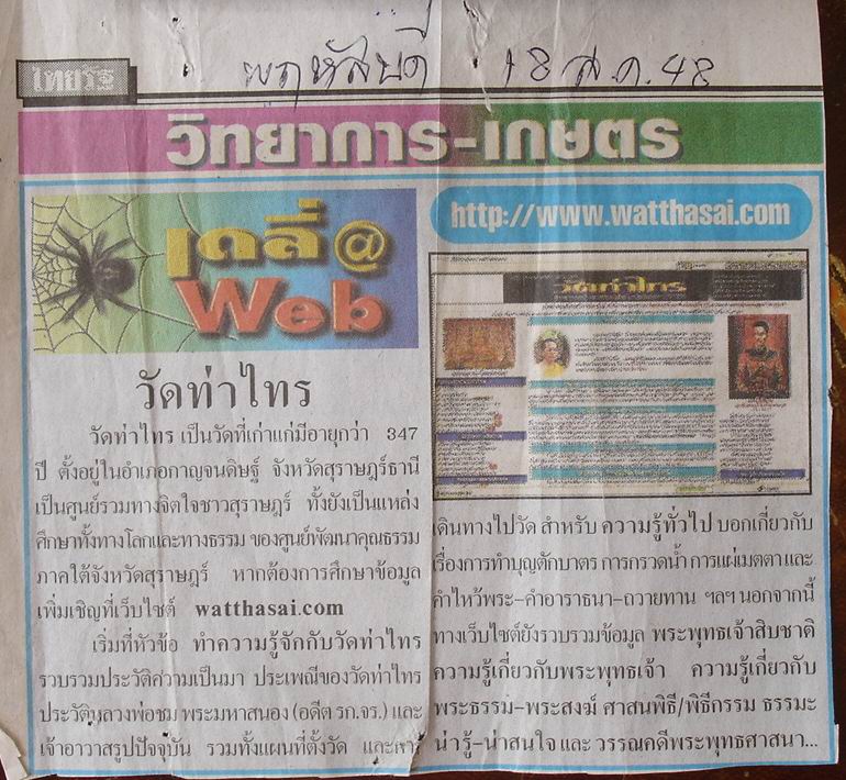 ฉบับวันที่ 18 ส.ค. 2548 ได้ให้เกียรติแก่วัดท่าไทรของเรา